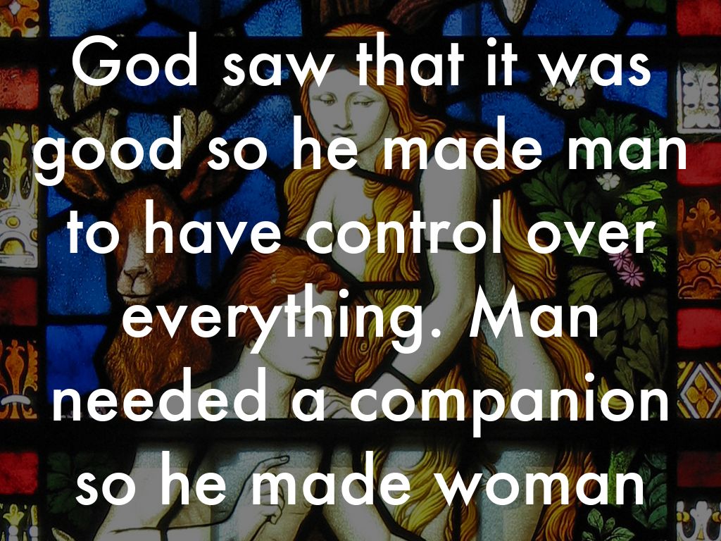 God saw that it was good so he made man to have control over everything. Man needed a companion so he made woman