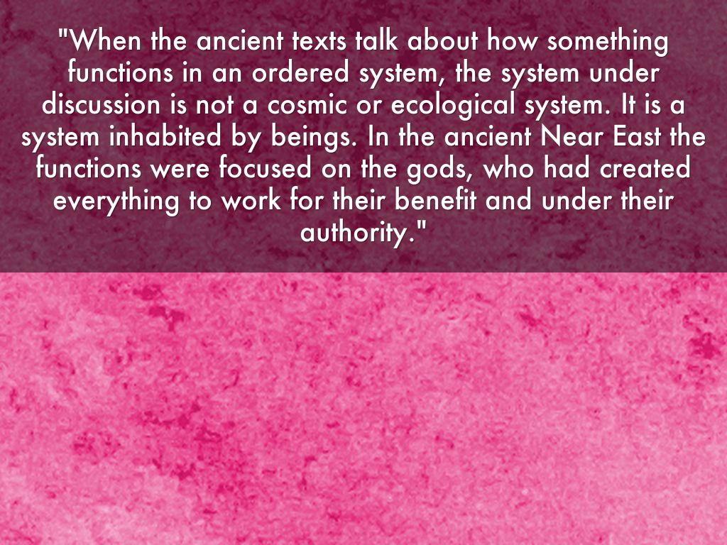 "When the ancient texts talk about how something functions in an ordered system, the system under discussion is not a cosmic or ecological system. It is a system inhabited by beings. In the ancient Near East the functions were focused on the gods, who had created everything to work for their benefit and under their authority."