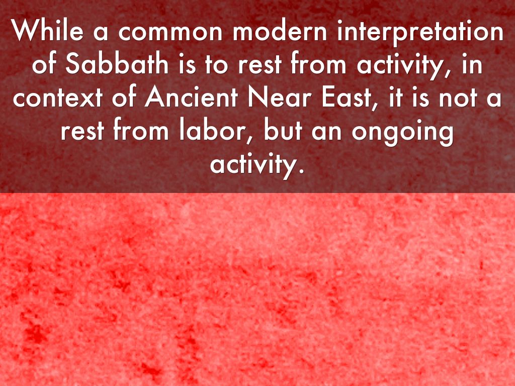 While a common modern interpretation of Sabbath is to rest from activity, in context of Ancient Near East, it is not a rest from labor, but an ongoing activity.