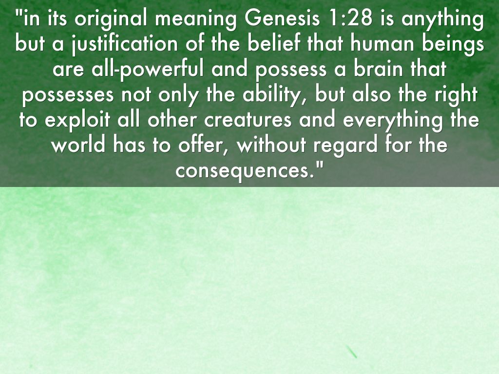 "in its original meaning Genesis 1:28 is anything but a justification of the belief that human beings are all-powerful and possess a brain that possesses not only the ability, but also the right to exploit all other creatures and everything the world has to offer, without regard for the consequences."