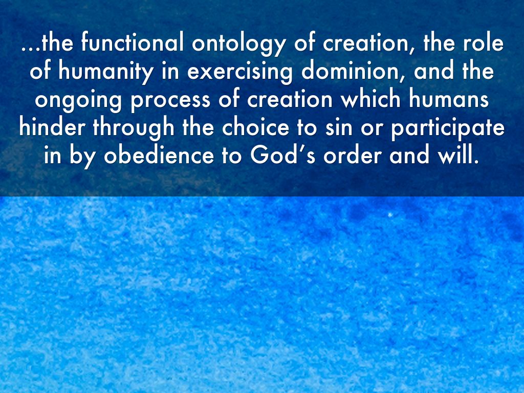 ...the functional ontology of creation, the role of humanity in exercising dominion, and the ongoing process of creation which humans hinder through the choice to sin or participate in by obedience to God’s order and will.