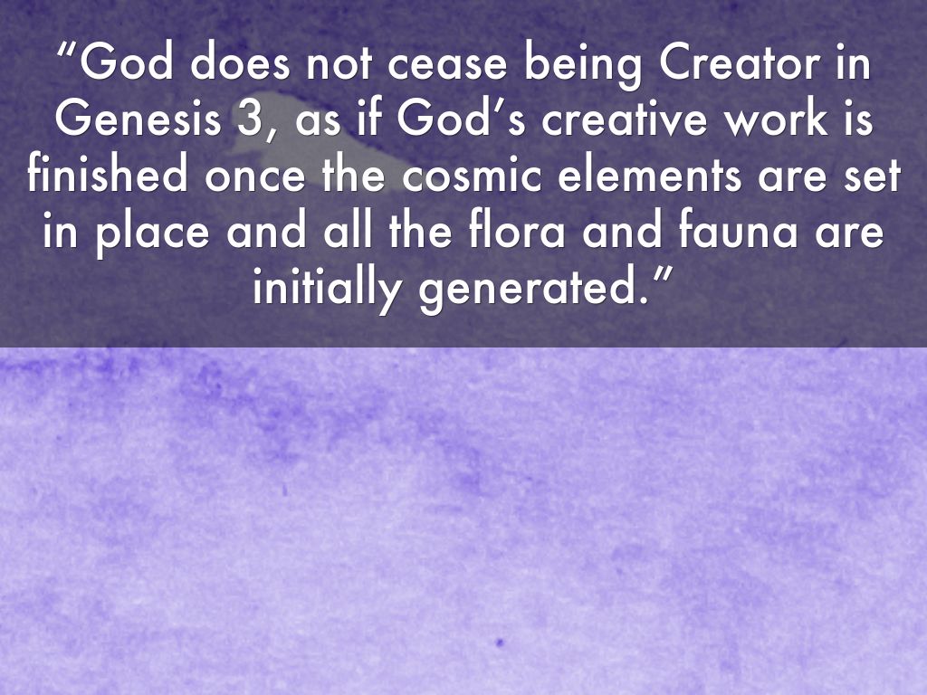 “God does not cease being Creator in Genesis 3, as if God’s creative work is finished once the cosmic elements are set in place and all the flora and fauna are initially generated.”