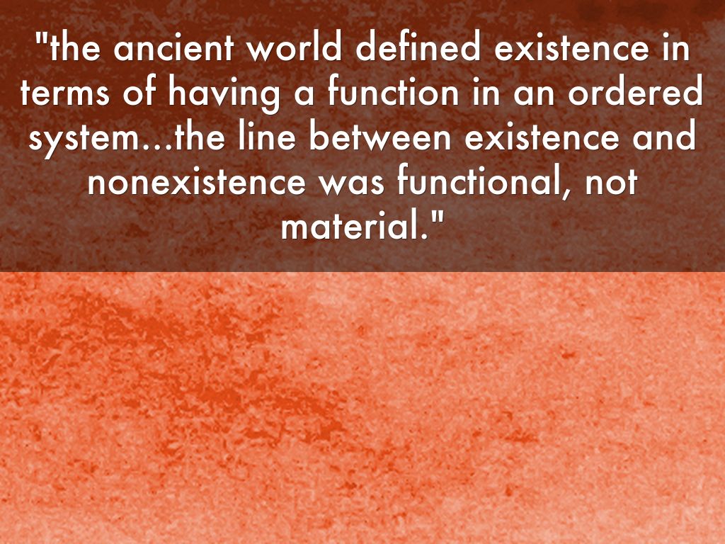 "the ancient world defined existence in terms of having a function in an ordered system...the line between existence and nonexistence was functional, not material."