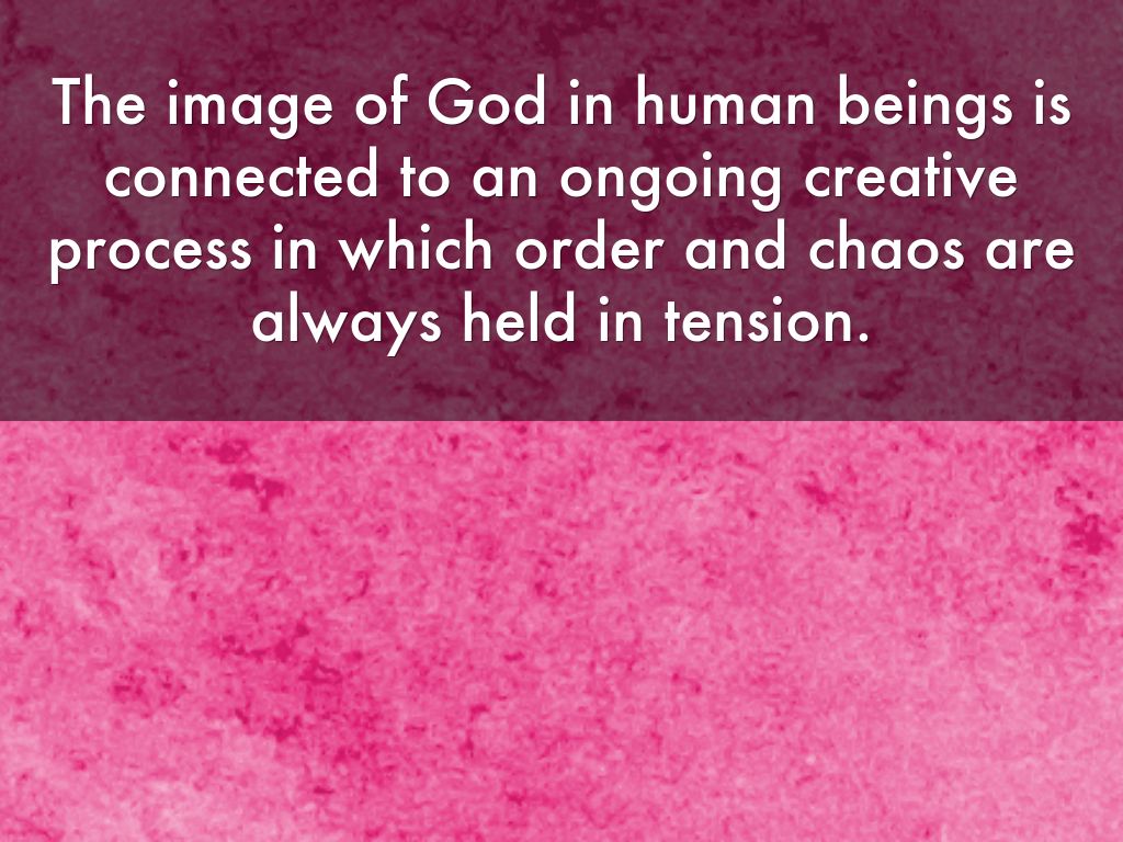 The image of God in human beings is connected to an ongoing creative process in which order and chaos are always held in tension.