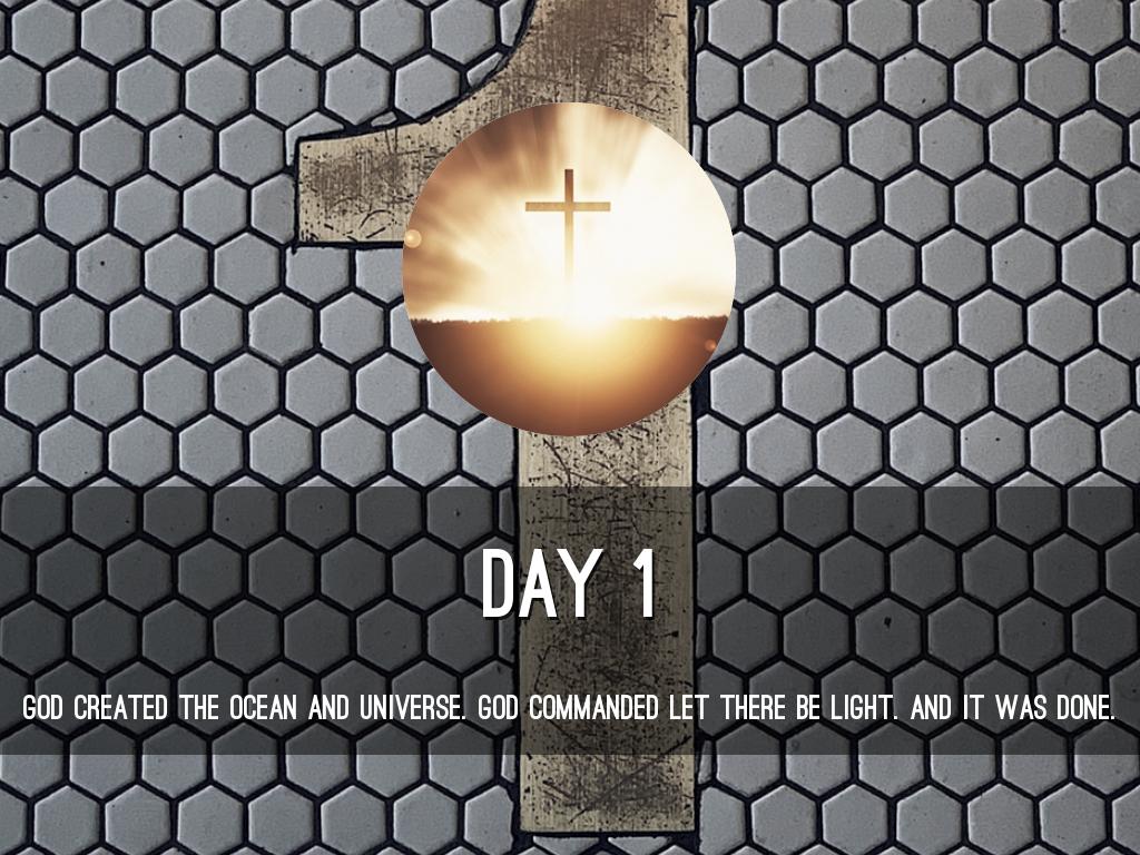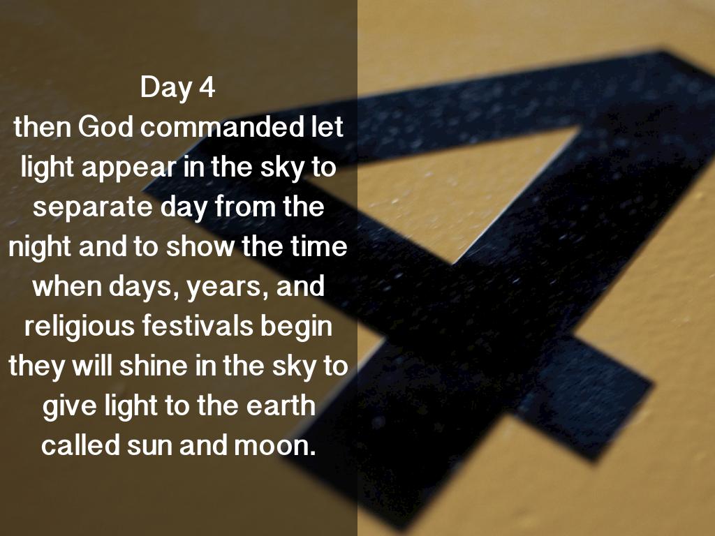 Day 4 then God commanded let light appear in the sky to separate day from the night and to show the time when days, years, and religious festivals begin they will shine in the sky to give light to the earth called sun and moon.