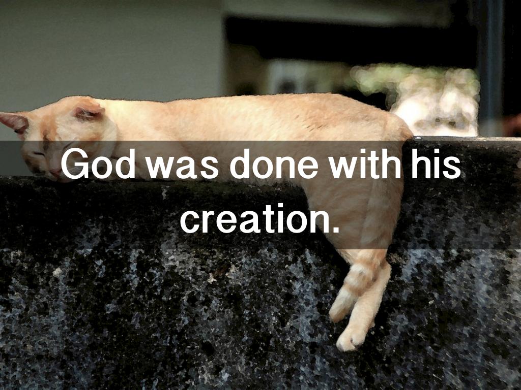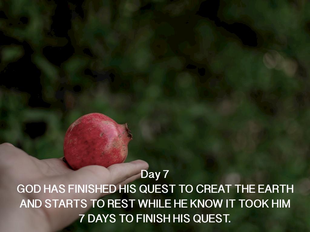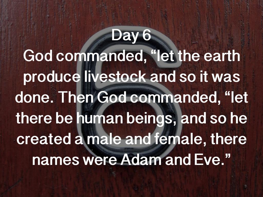 Day 6 God commanded, “let the earth produce livestock and so it was done. Then God commanded, “let there be human beings, and so he created a male and female, there names were Adam and Eve.”