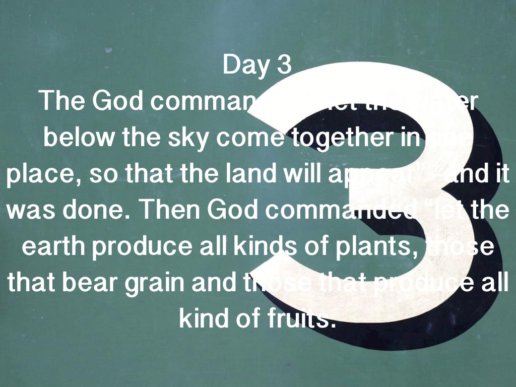 Day 3 The God commanded, “let the water below the sky come together in one place, so that the land will appear” —and it was done. Then God commanded “let the earth produce all kinds of plants, those that bear grain and those that produce all kind of fruits.