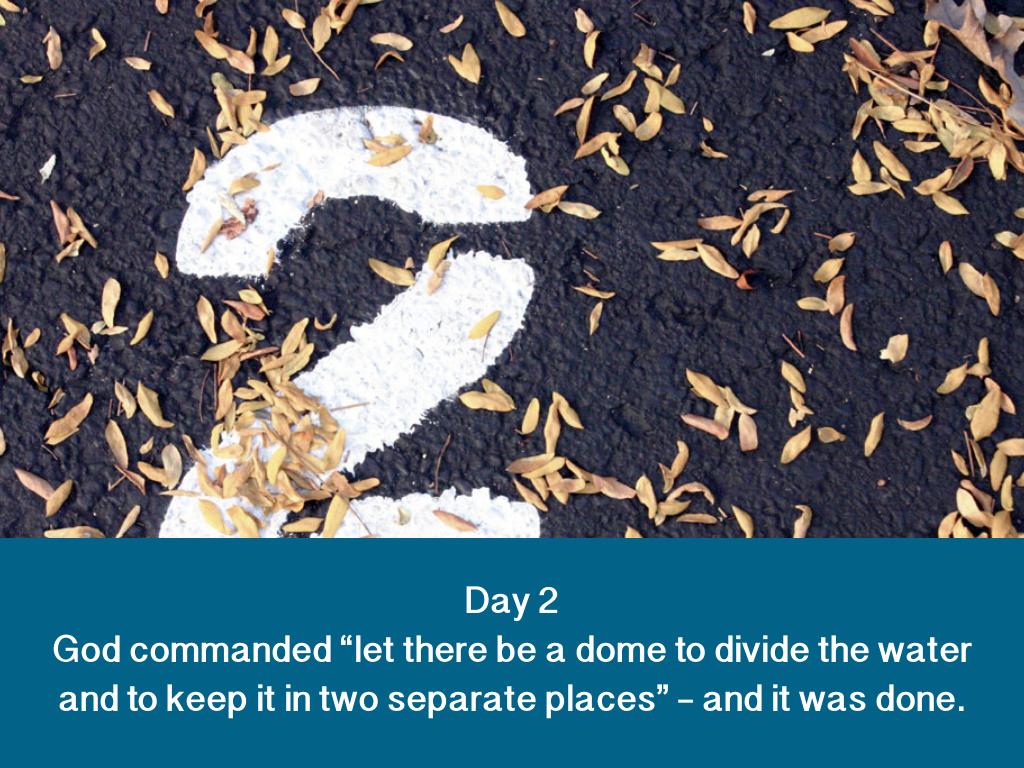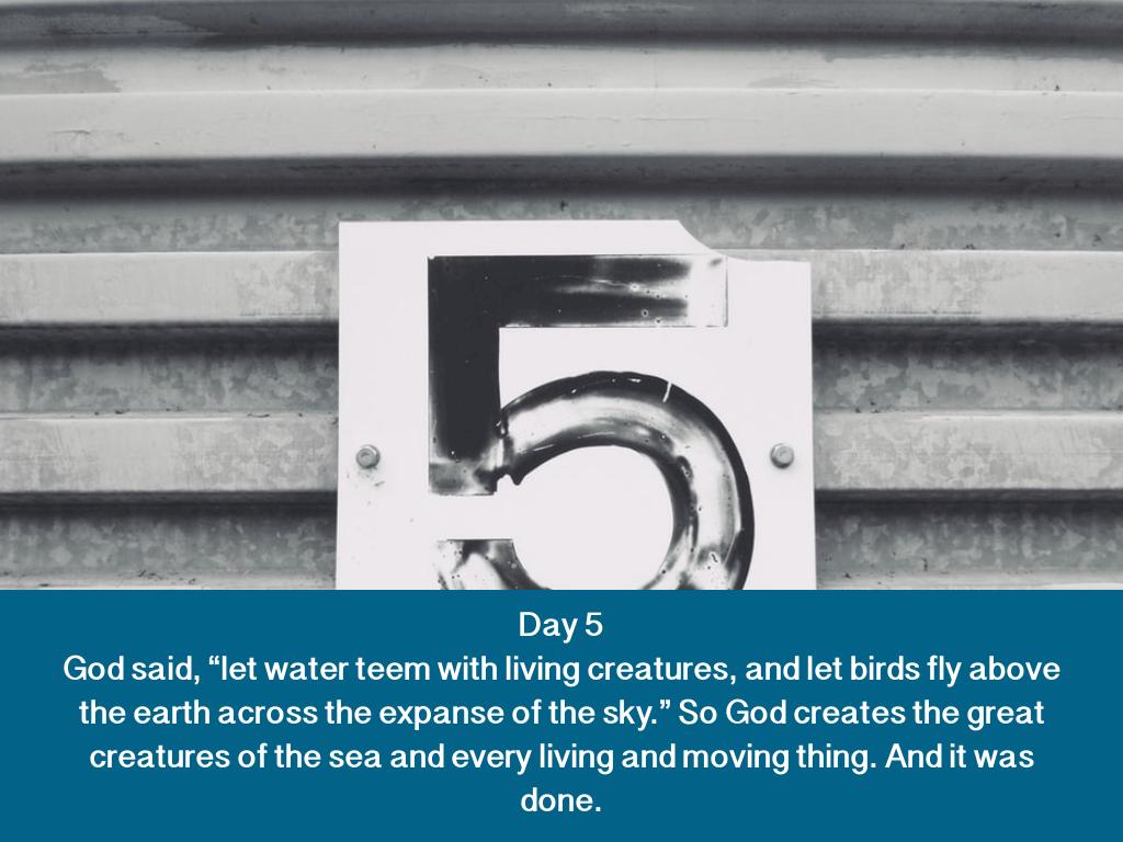 Day 5 God said, “let water teem with living creatures, and let birds fly above the earth across the expanse of the sky.” So God creates the great creatures of the sea and every living and moving thing. And it was done.