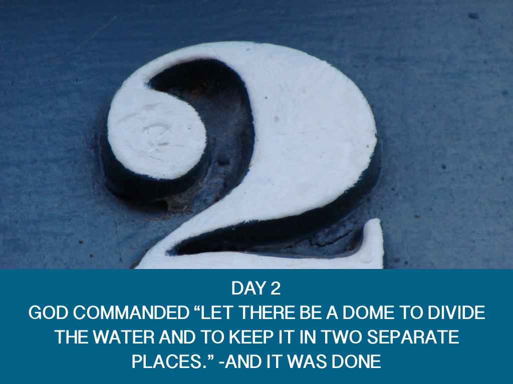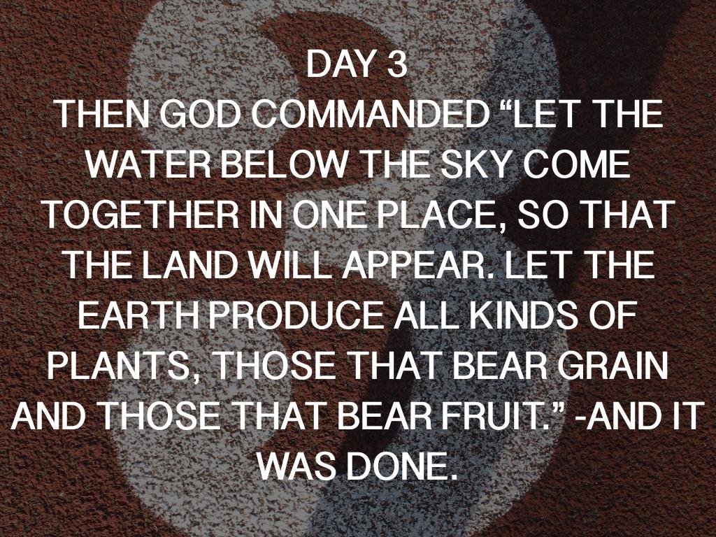 DAY 3 THEN GOD COMMANDED “LET THE WATER BELOW THE SKY COME TOGETHER IN ONE PLACE, SO THAT THE LAND WILL APPEAR. LET THE EARTH PRODUCE ALL KINDS OF PLANTS, THOSE THAT BEAR GRAIN AND THOSE THAT BEAR FRUIT.” -AND IT WAS DONE.
