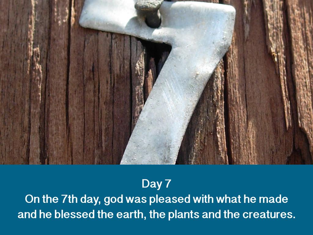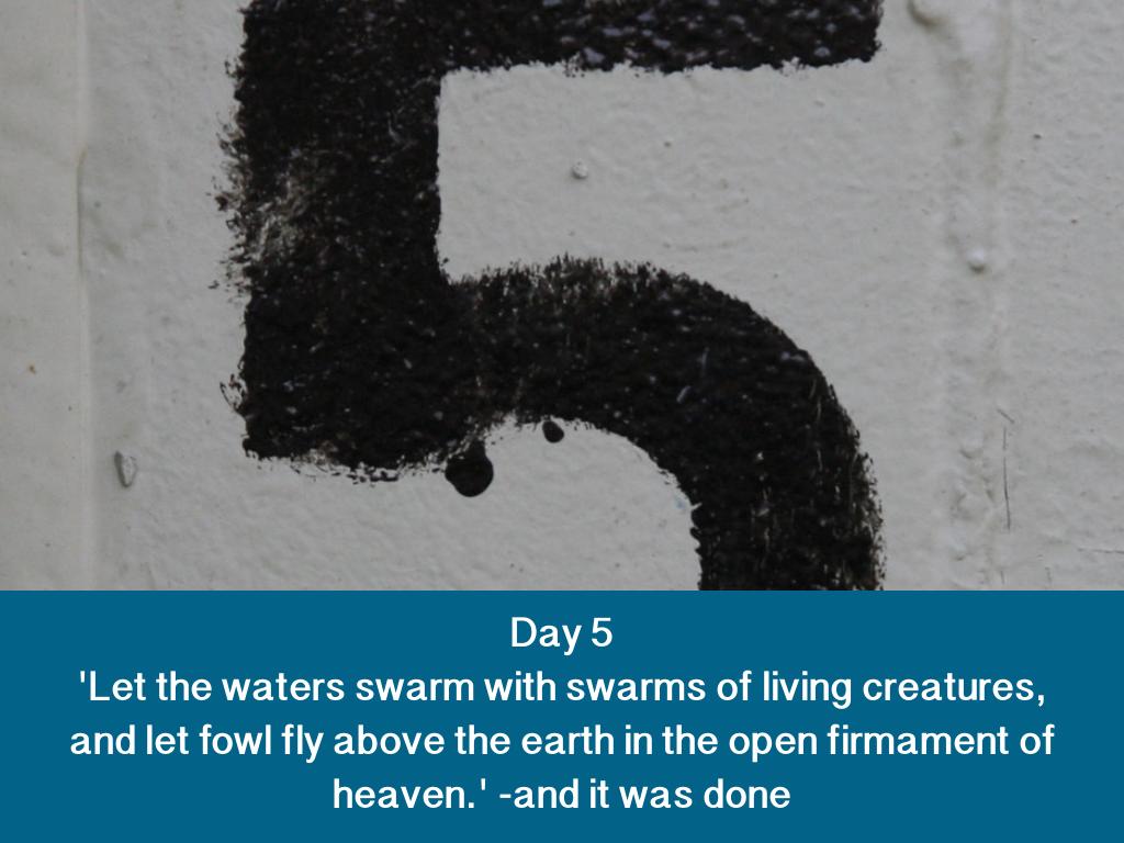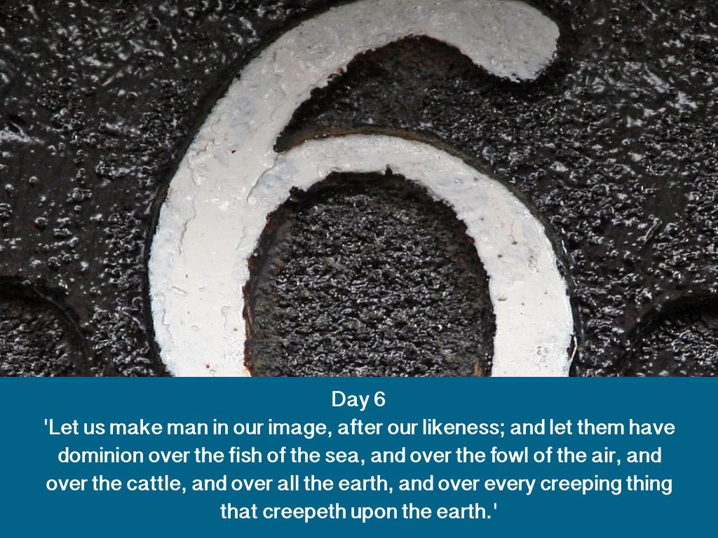Day 6 'Let us make man in our image, after our likeness; and let them have dominion over the fish of the sea, and over the fowl of the air, and over the cattle, and over all the earth, and over every creeping thing that creepeth upon the earth.'