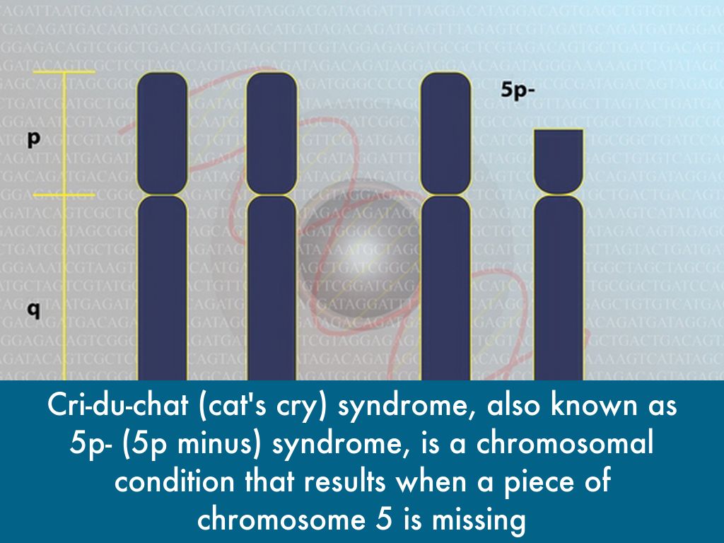 Cri-du-chat (cat's cry) syndrome, also known as 5p- (5p minus) syndrome, is a chromosomal condition that results when a piece of chromosome 5 is missing