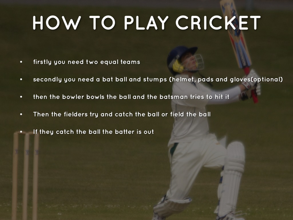 secondly you need a bat ball and stumps (helmet, pads and gloves(optional)