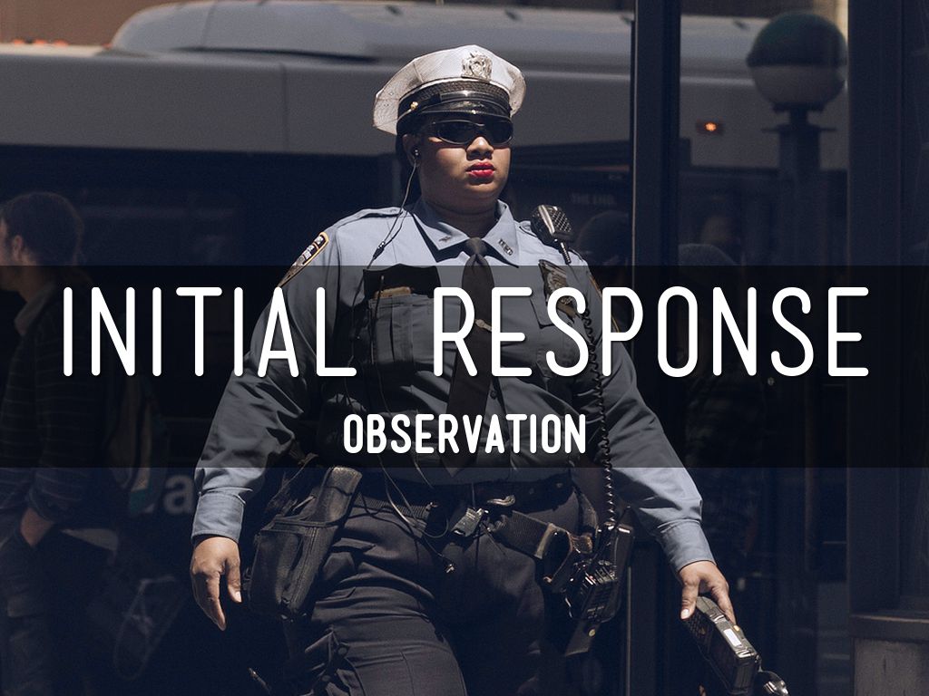The initial response should be prompt, yet cautious. Remaining observant for any persons, vehicles, events, potential evidence, & environmental conditions.