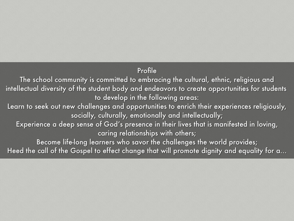 The school community is committed to embracing the cultural, ethnic, religious and intellectual diversity of the student body and endeavors to create opportunities for students to develop in the following areas: