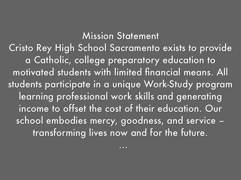 Cristo Rey High School Sacramento exists to provide a Catholic, college preparatory education to motivated students with limited financial means. All students participate in a unique Work-Study program learning professional work skills and generating income to offset the cost of their education. Our school embodies mercy, goodness, and service – transforming lives now and for the future.