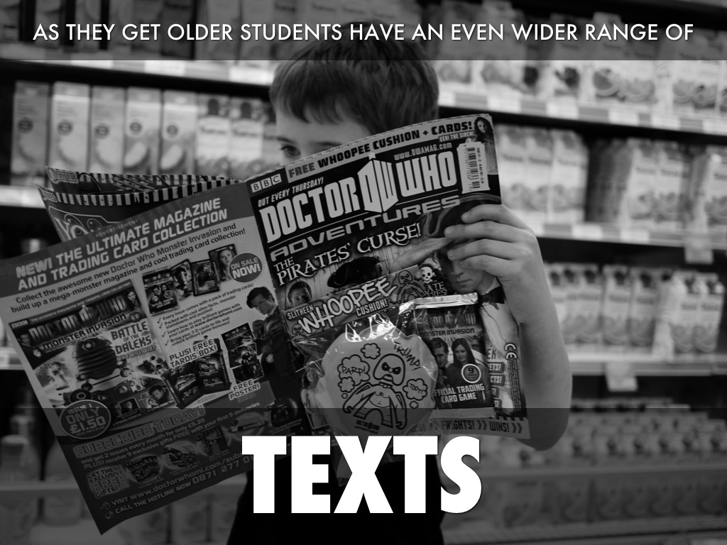 Students today experience a constant stream of ideas and information through online, print, electronic games and mass media. As they get older students have an even wider range of texts.