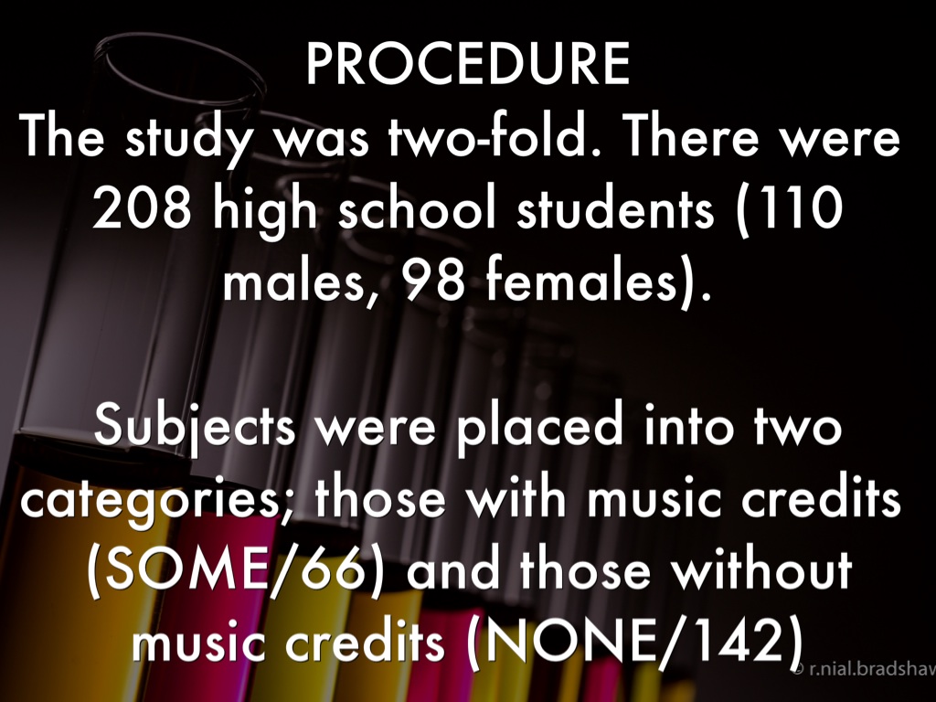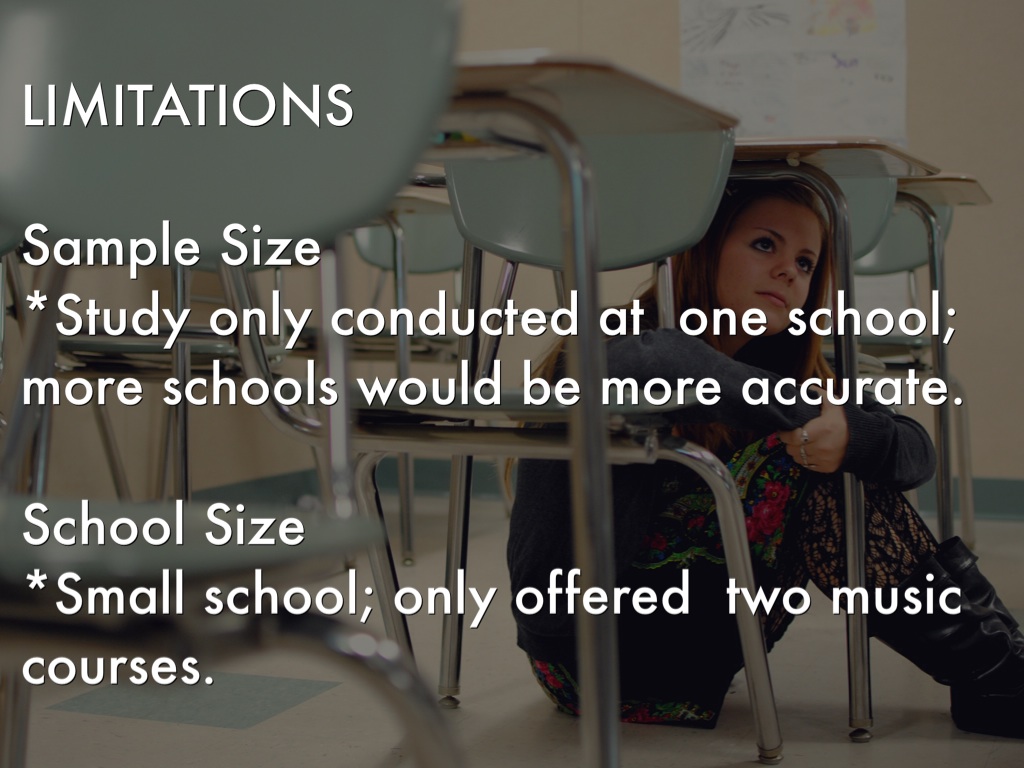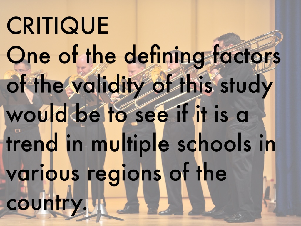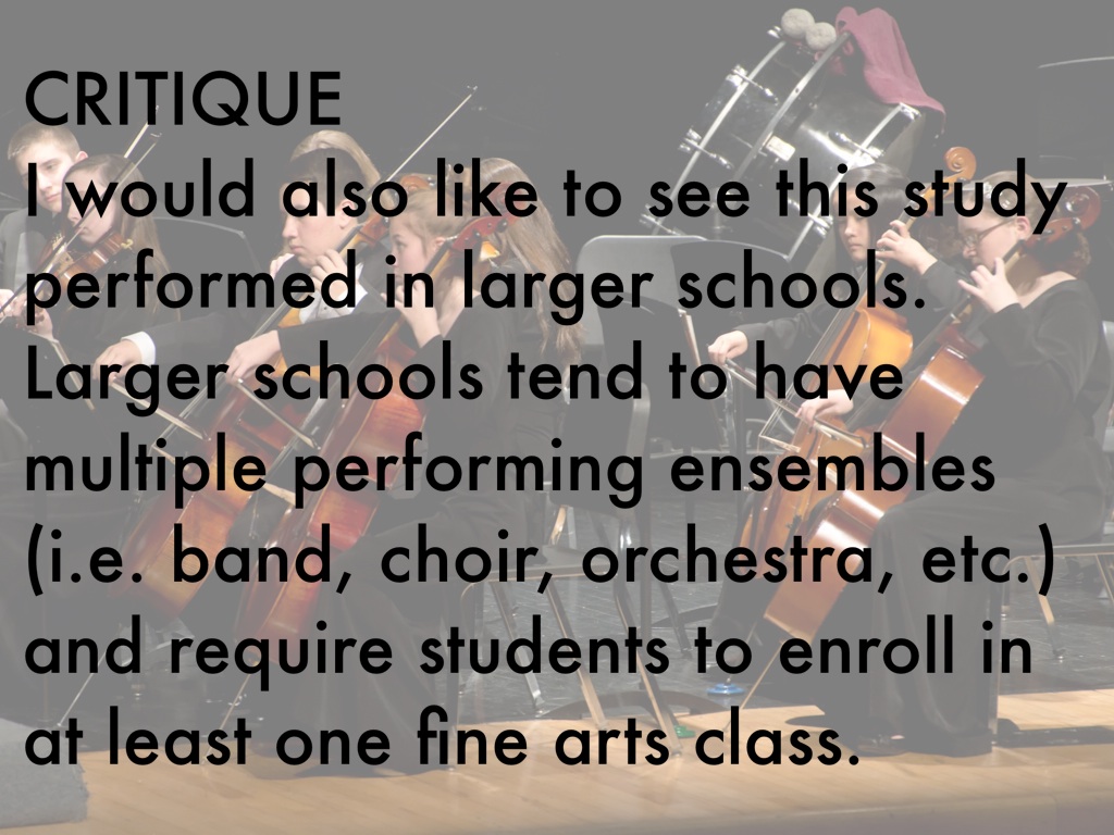 CRITIQUE I would also like to see this study performed in larger schools. Larger schools tend to have multiple performing ensembles (i.e. band, choir, orchestra, etc.) and require students to enroll in at least one fine arts class.
