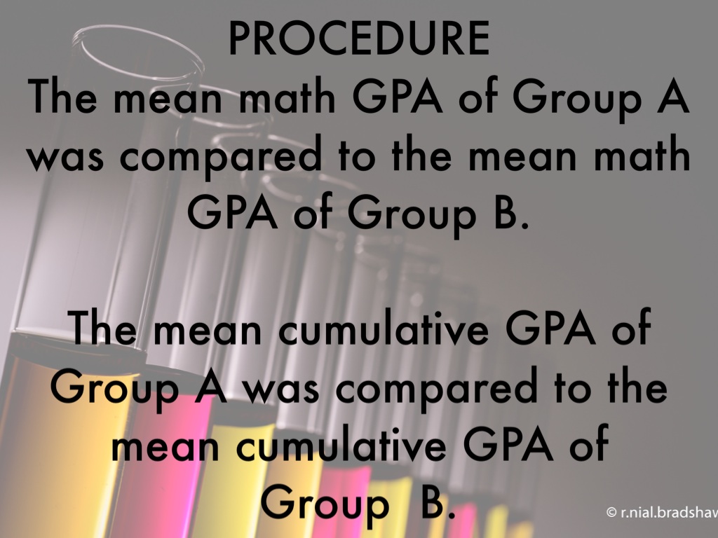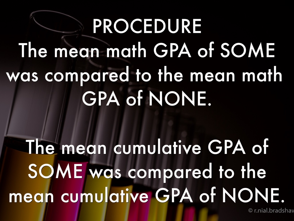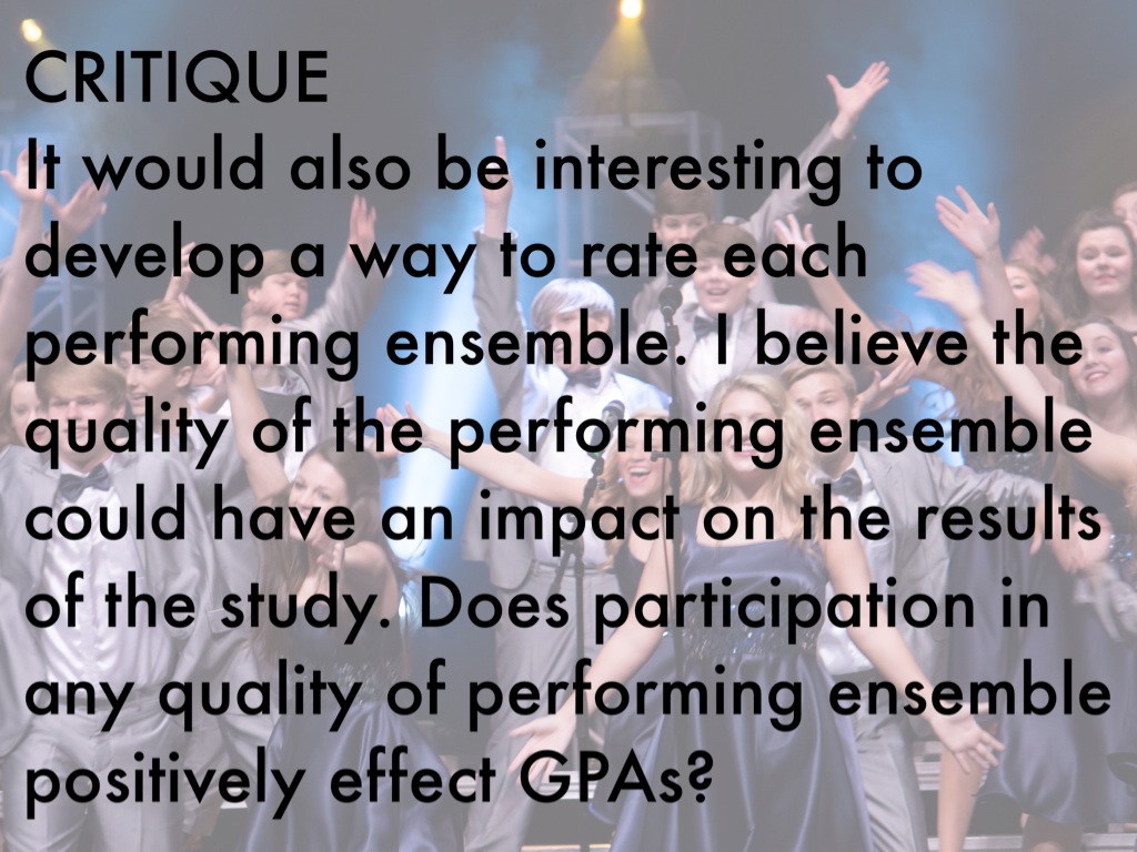 CRITIQUE It would also be interesting to develop a way to rate each performing ensemble. I believe the quality of the performing ensemble could have an impact on the results of the study. Does participation in any quality of performing ensemble positively effect GPAs?