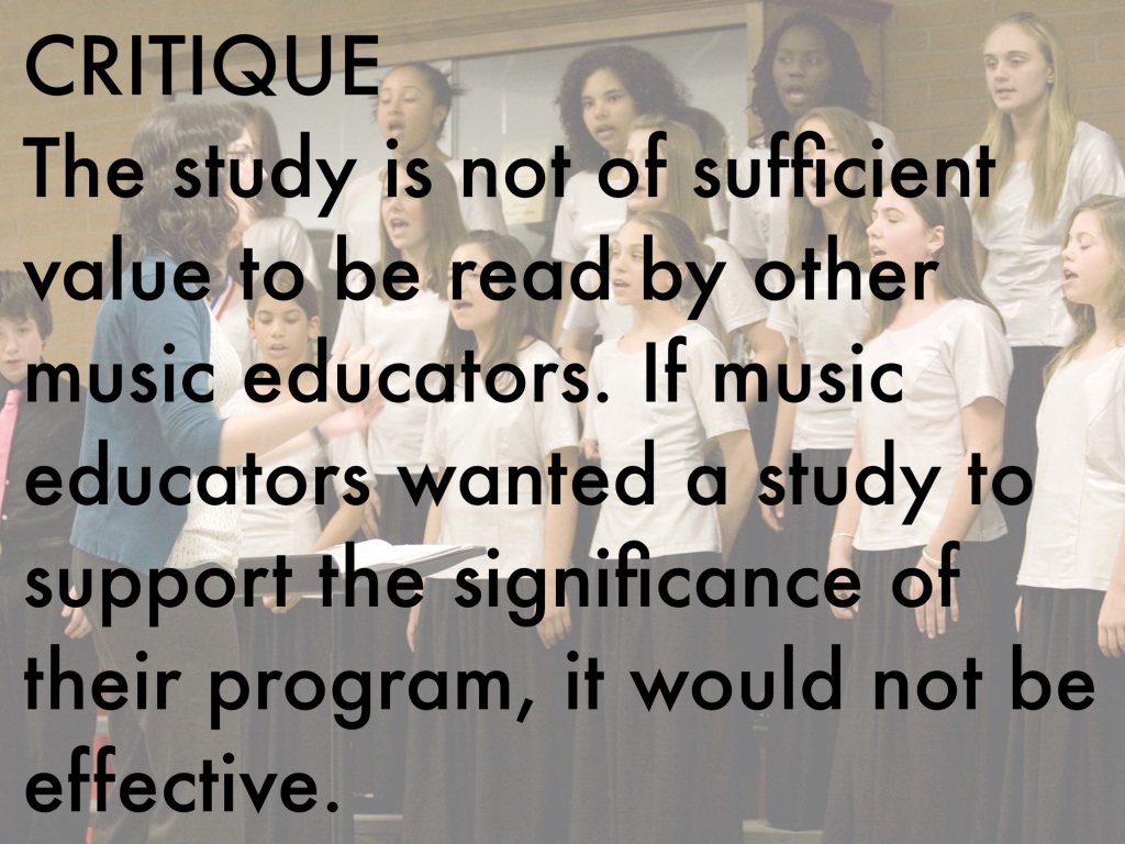 CRITIQUE The study is not of sufficient value to be read by other music educators. If music educators wanted a study to support the significance of their program, it would not be effective.