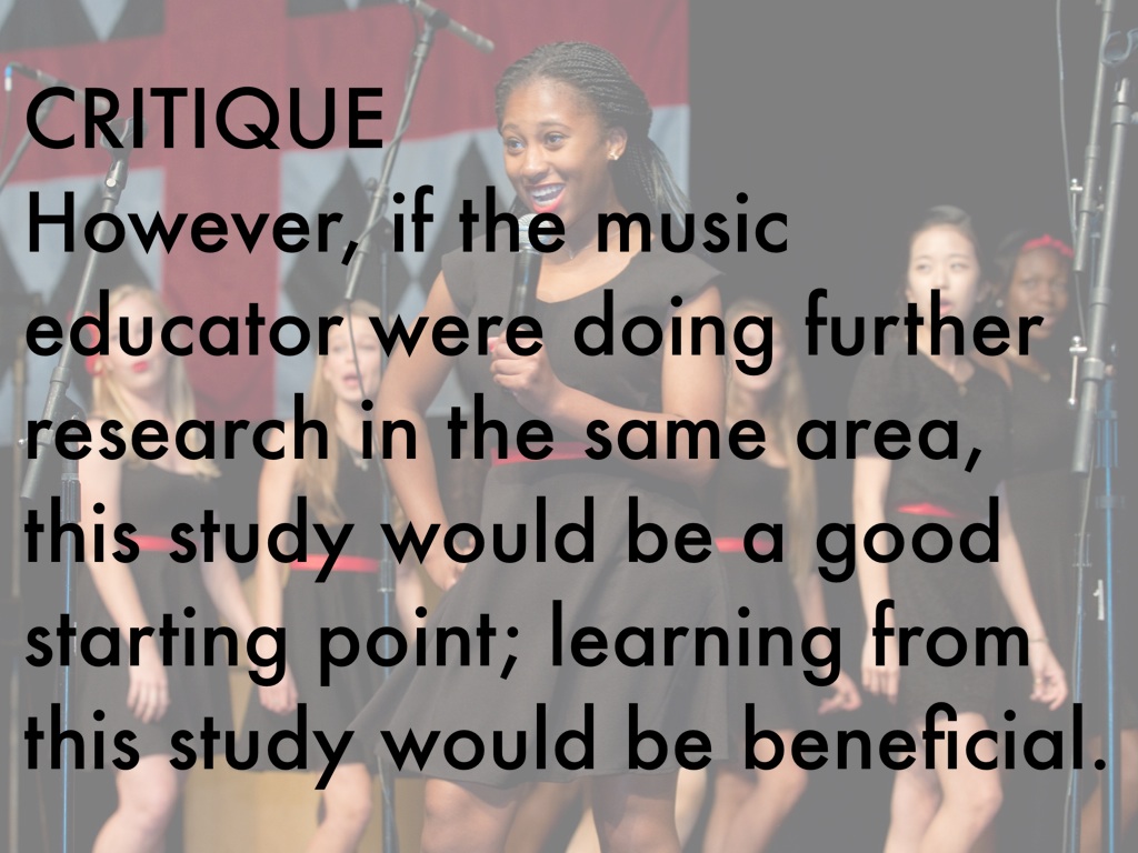 CRITIQUE However, if the music educator were doing further research in the same area, this study would be a good starting point; learning from this study would be beneficial.