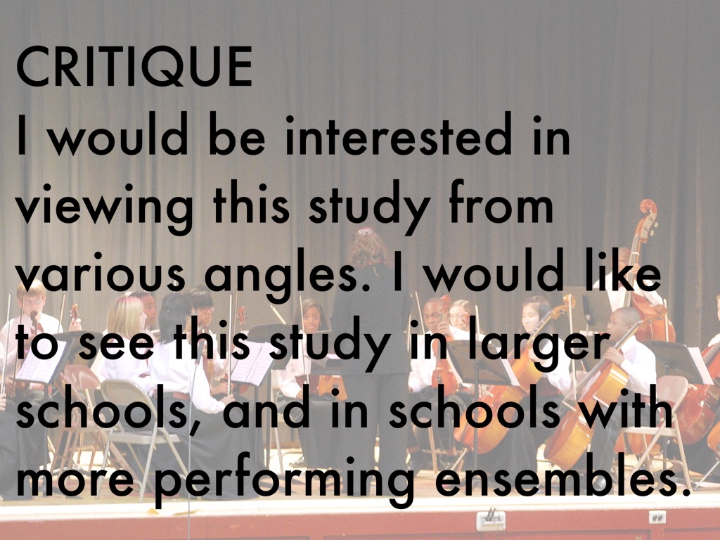 CRITIQUE I would be interested in viewing this study from various angles. I would like to see this study in larger schools, and in schools with more performing ensembles.
