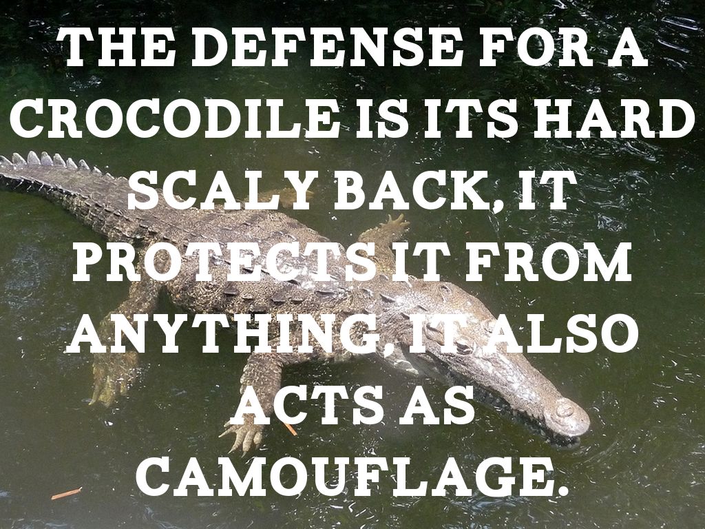 The defense for a crocodile is its hard scaly back, it protects it from anything, it also acts as camouflage.