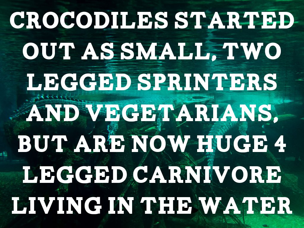 Crocodiles started out as small, two legged sprinters and vegetarians, but are now huge 4 legged carnivore living in the water