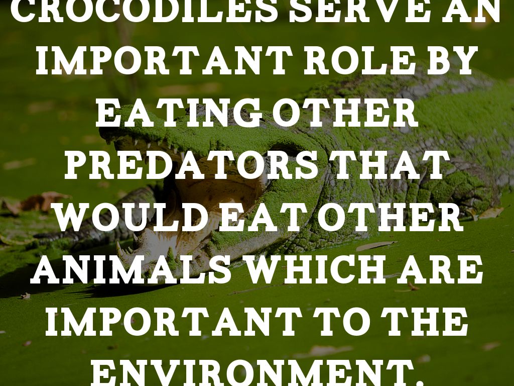 Crocodiles serve an important role by eating other predators that would eat other animals which are important to the environment.
