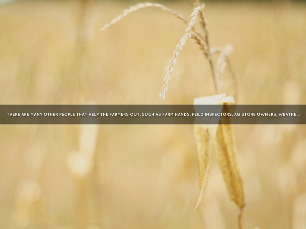 THERE ARE MANY OTHER PEOPLE THAT HELP THE FARMERS OUT, SUCH AS FARM HANDS, FEILD INSPECTORS, AG STORE OWNERS, WEATHER MEN, TRACTOR SALESMAN AND MANY OTHER THINGS