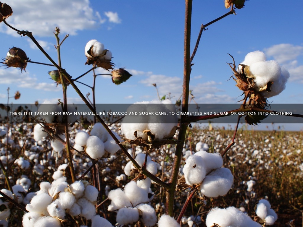 THERE IT IT TAKEN FROM RAW MATERIAL, LIKE TOBACCO AND SUGAR CANE, TO CIGARETTES AND SUGAR, OR COTTON INTO CLOTHING