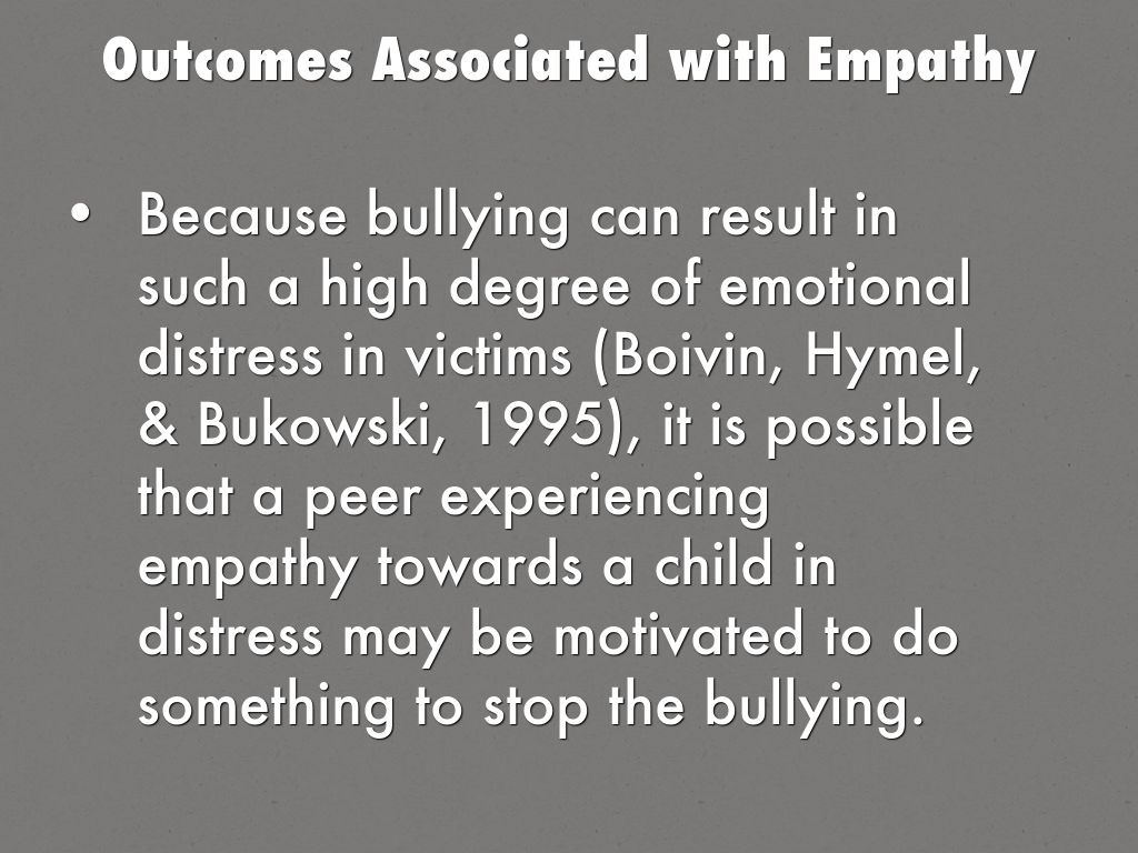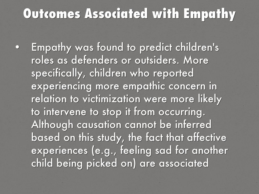 - Empathy was found to predict children's roles as defenders or outsiders. More specifically, children who reported experiencing more empathic concern in relation to victimization were more likely to intervene to stop it from occurring. Although causation cannot be inferred based on this study, the fact that affective experiences (e.g., feeling sad for another child being picked on) are associated with the tendency to intervene lends support to the notion that instilling empathy in children may be important in overcoming the passive bystander phenomenon.