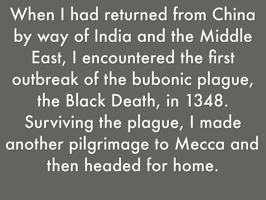 When I had returned from China by way of India and the Middle East, I encountered the first outbreak of the bubonic plague, the Black Death, in 1348. Surviving the plague, I made another pilgrimage to Mecca and then headed for home.