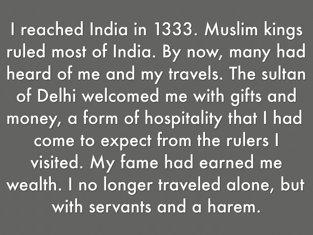 I reached India in 1333. Muslim kings ruled most of India. By now, many had heard of me and my travels. The sultan of Delhi welcomed me with gifts and money, a form of hospitality that I had come to expect from the rulers I visited. My fame had earned me wealth. I no longer traveled alone, but with servants and a harem.