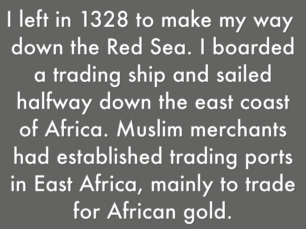 I left in 1328 to make my way down the Red Sea. I boarded a trading ship and sailed halfway down the east coast of Africa. Muslim merchants had established trading ports in East Africa, mainly to trade for African gold.