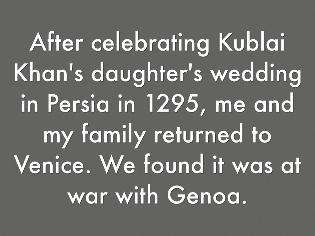 After celebrating Kublai Khan's daughter's wedding in Persia in 1295, me and my family returned to Venice. We found it was at war with Genoa.