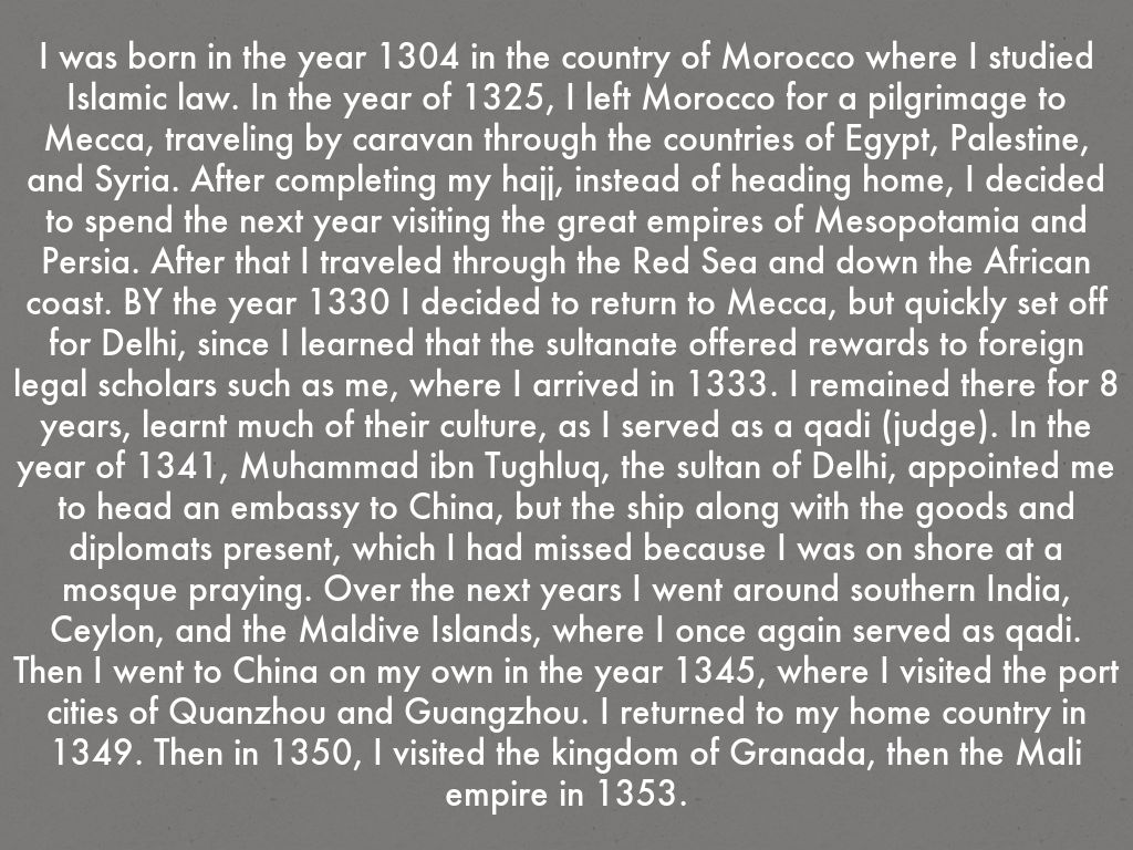 I was born in the year 1304 in the country of Morocco where I studied Islamic law. In the year of 1325, I left Morocco for a pilgrimage to Mecca, traveling by caravan through the countries of Egypt, Palestine, and Syria. After completing my hajj, instead of heading home, I decided to spend the next year visiting the great empires of Mesopotamia and Persia. After that I traveled through the Red Sea and down the African coast. BY the year 1330 I decided to return to Mecca, but quickly set off for Delhi, since I learned that the sultanate offered rewards to foreign legal scholars such as me, where I arrived in 1333. I remained there for 8 years, learnt much of their culture, as I served as a qadi (judge). In the year of 1341, Muhammad ibn Tughluq, the sultan of Delhi, appointed me to head an embassy to China, but the ship along with the goods and diplomats present, which I had missed because I was on shore at a mosque praying. Over the next years I went around southern India, Ceylon, and the Maldive Islands, where I once again served as qadi. Then I went to China on my own in the year 1345, where I visited the port cities of Quanzhou and Guangzhou. I returned to my home country in 1349. Then in 1350, I visited the kingdom of Granada, then the Mali empire in 1353.