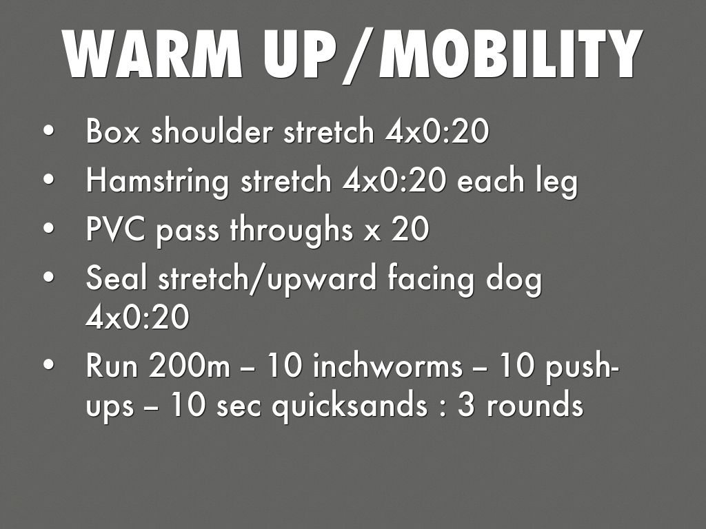 - Run 200m -- 10 inchworms -- 10 push-ups -- 10 sec quicksands : 3 rounds