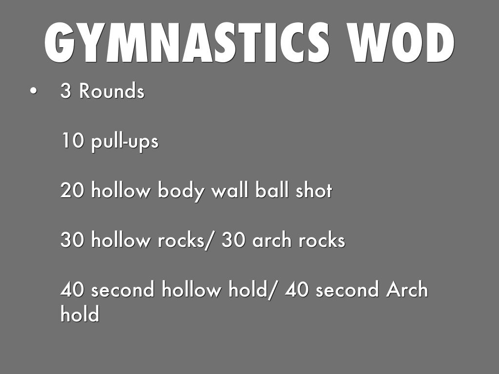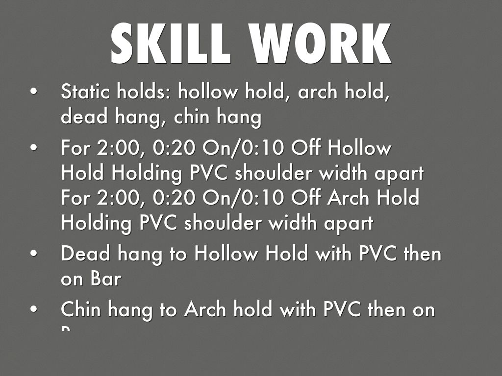 - Static holds: hollow hold, arch hold, dead hang, chin hang