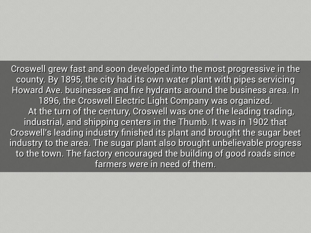At the turn of the century, Croswell was one of the leading trading, industrial, and shipping centers in the Thumb. It was in 1902 that Croswell's leading industry finished its plant and brought the sugar beet industry to the area. The sugar plant also brought unbelievable progress to the town. The factory encouraged the building of good roads since farmers were in need of them.