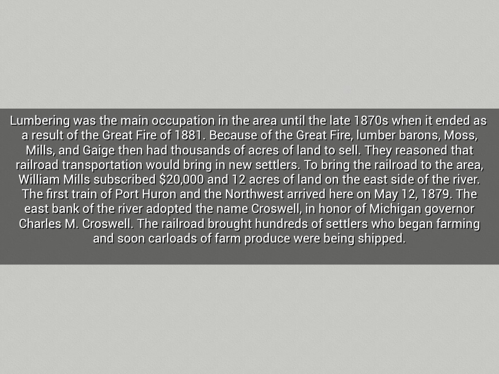 Lumbering was the main occupation in the area until the late 1870s when it ended as a result of the Great Fire of 1881. Because of the Great Fire, lumber barons, Moss, Mills, and Gaige then had thousands of acres of land to sell. They reasoned that railroad transportation would bring in new settlers. To bring the railroad to the area, William Mills subscribed $20,000 and 12 acres of land on the east side of the river. The first train of Port Huron and the Northwest arrived here on May 12, 1879. The east bank of the river adopted the name Croswell, in honor of Michigan governor Charles M. Croswell. The railroad brought hundreds of settlers who began farming and soon carloads of farm produce were being shipped.