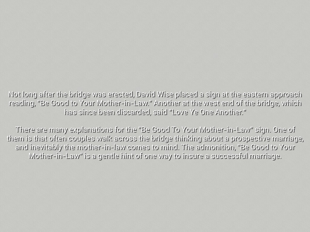 Not long after the bridge was erected, David Wise placed a sign at the eastern approach reading, "Be Good to Your Mother-in-Law." Another at the west end of the bridge, which has since been discarded, said "Love Ye One Another."