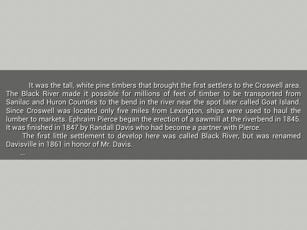 It was the tall, white pine timbers that brought the first settlers to the Croswell area. The Black River made it possible for millions of feet of timber to be transported from Sanilac and Huron Counties to the bend in the river near the spot later called Goat Island. Since Croswell was located only five miles from Lexington, ships were used to haul the lumber to markets. Ephraim Pierce began the erection of a sawmill at the riverbend in 1845. It was finished in 1847 by Randall Davis who had become a partner with Pierce.