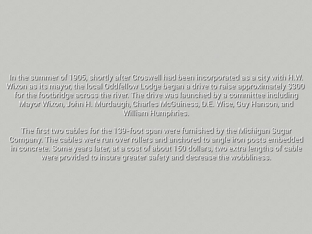 In the summer of 1905, shortly after Croswell had been incorporated as a city with H.W. Wixon as its mayor, the local Oddfellow Lodge began a drive to raise approximately $300 for the footbridge across the river. The drive was launched by a committee including Mayor Wixon, John H. Murdaugh, Charles McGuiness, D.E. Wise, Guy Hanson, and William Humphries.
