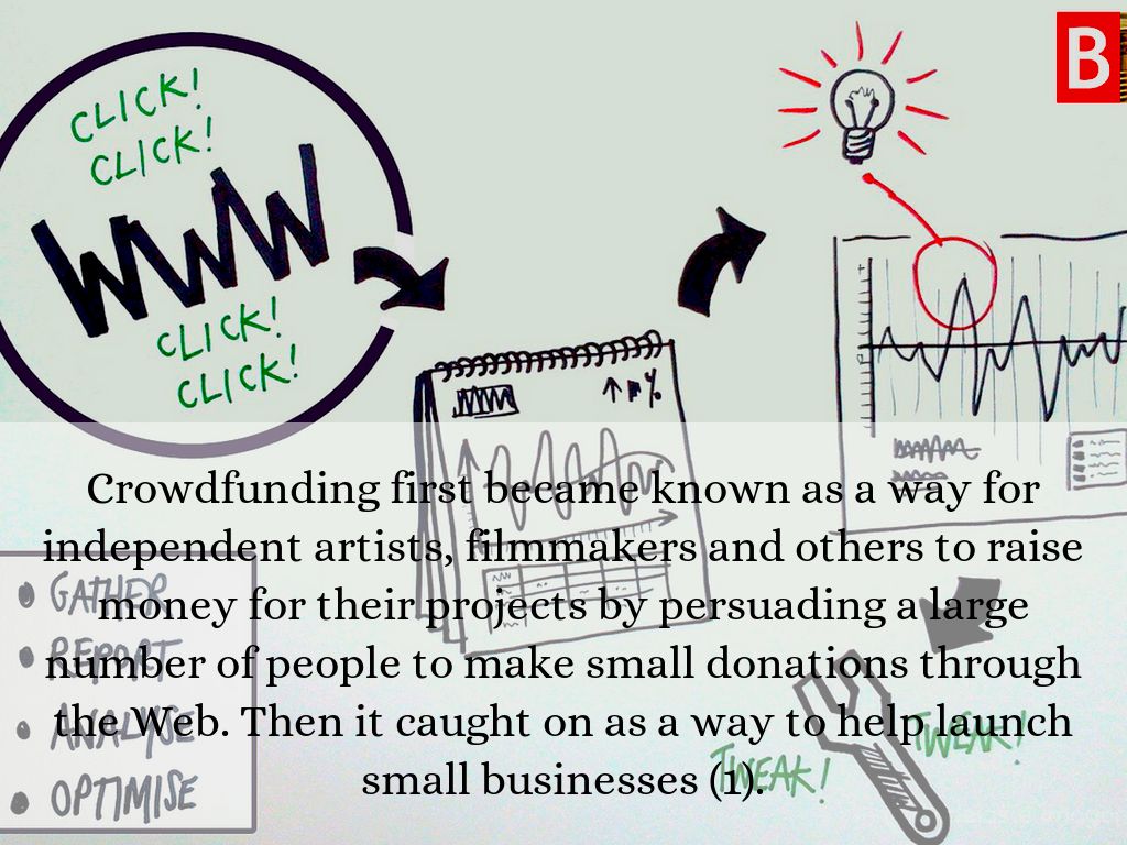Crowdfunding first became known as a way for independent artists, filmmakers and others to raise money for their projects by persuading a large number of people to make small donations through the Web. Then it caught on as a way to help launch small businesses (1).