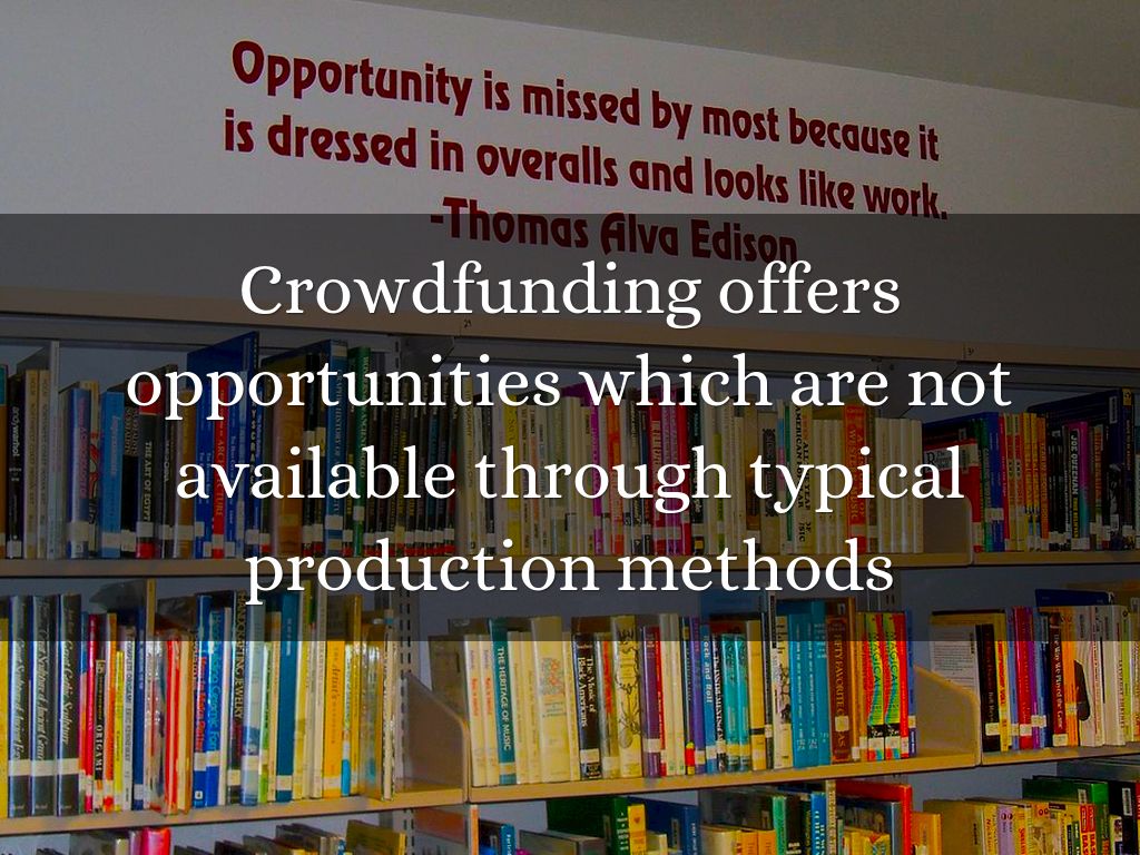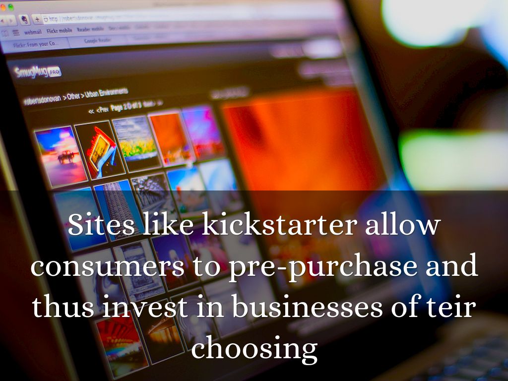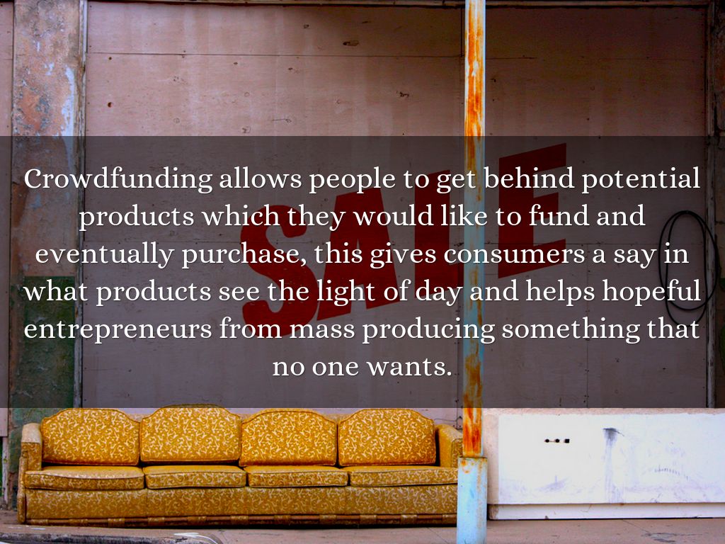 Crowdfunding allows people to get behind potential products which they would like to fund and eventually purchase, this gives consumers a say in what products see the light of day and helps hopeful entrepreneurs from mass producing something that no one wants.
