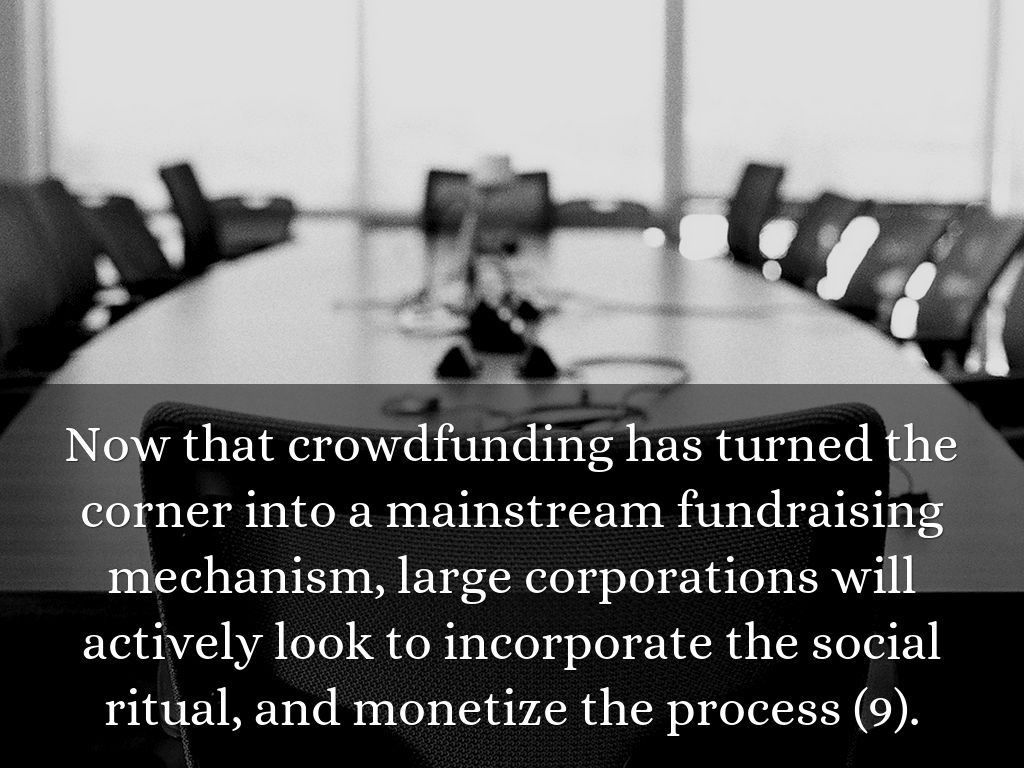 Now that crowdfunding has turned the corner into a mainstream fundraising mechanism, large corporations will actively look to incorporate the social ritual, and monetize the process (9).