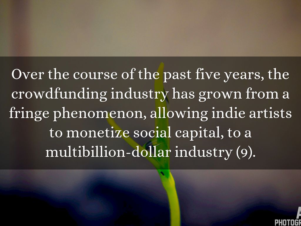 Over the course of the past five years, the crowdfunding industry has grown from a fringe phenomenon, allowing indie artists to monetize social capital, to a multibillion-dollar industry (9).