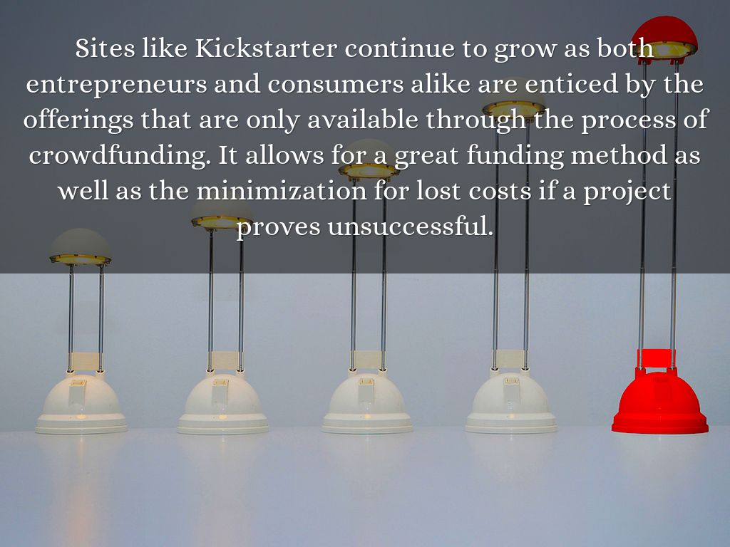 Sites like Kickstarter continue to grow as both entrepreneurs and consumers alike are enticed by the offerings that are only available through the process of crowdfunding. It allows for a great funding method as well as the minimization for lost costs if a project proves unsuccessful.