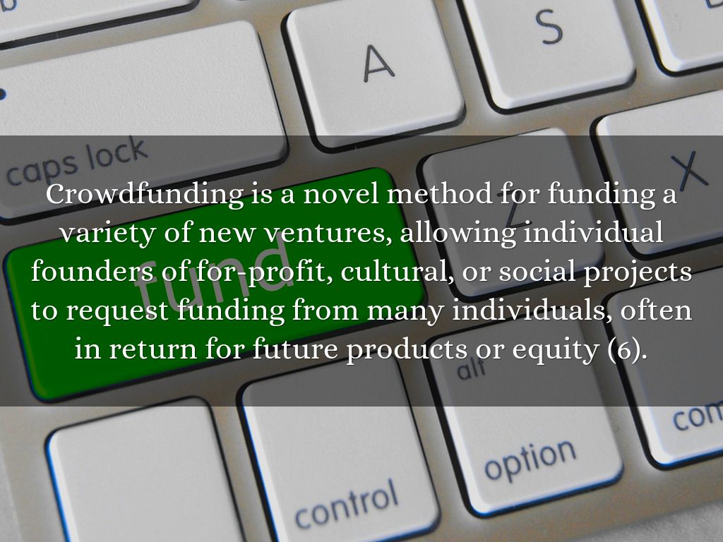 Crowdfunding is a novel method for funding a variety of new ventures, allowing individual founders of for-profit, cultural, or social projects to request funding from many individuals, often in return for future products or equity (6).