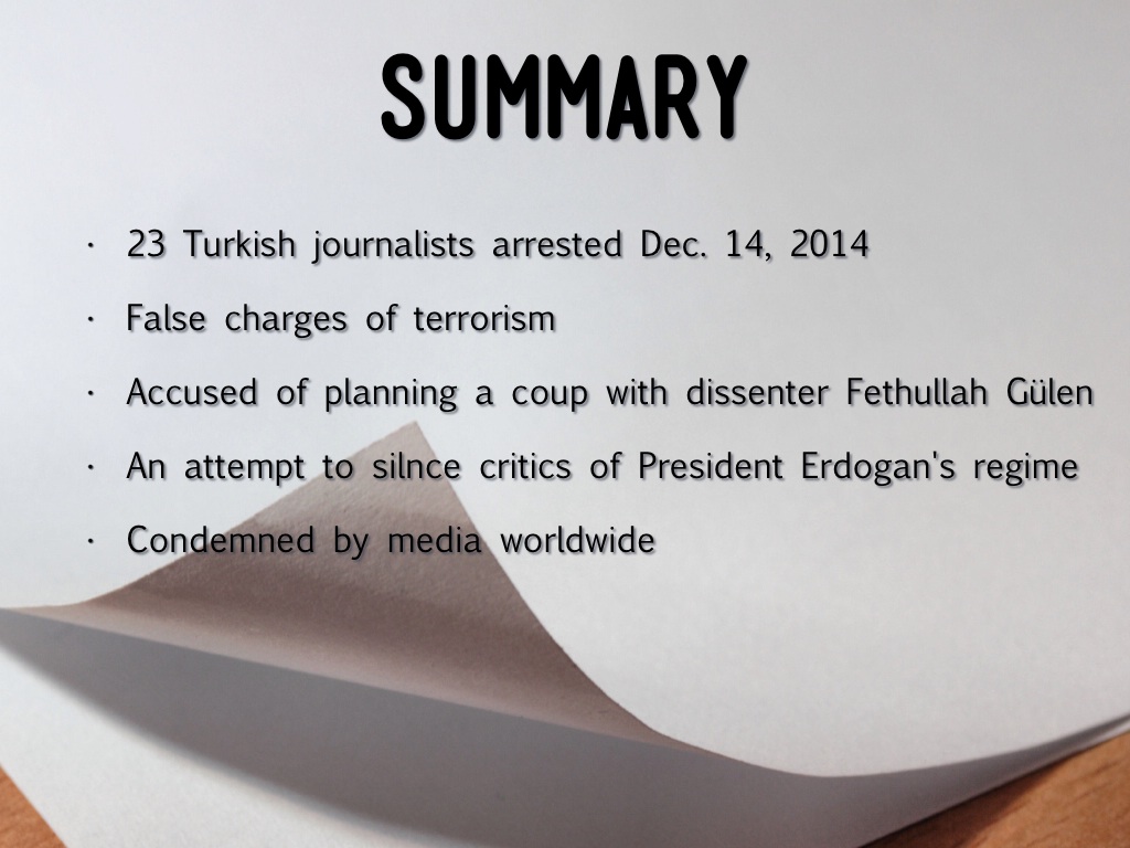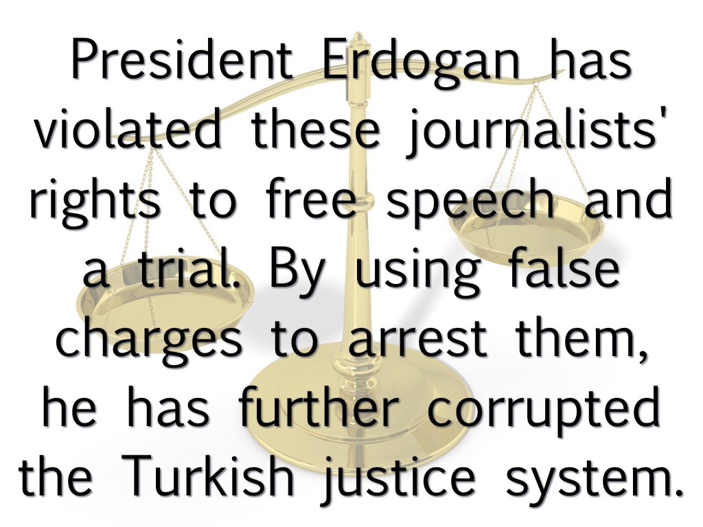 President Erdogan has violated these journalists' rights to free speech and a trial. By using false charges to arrest them, he has further corrupted the Turkish justice system.
